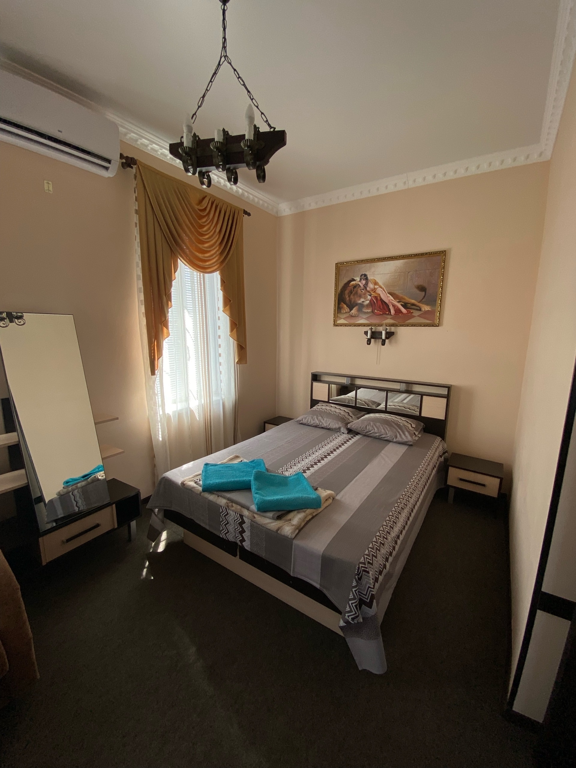 1-2-3-х местные номера стандарт: двуспальная кровать, односпальный диван/двуспальный диван,санузел с душевой, ТВ, холодильник, сплит система, тумбочки, шкаф, зеркало, полотенце.